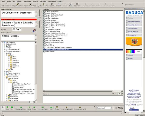Программа Raduga - отвечает стандартам радиоавтоматизации. Это ПО для всех коммерческих Станций, LPFM, Part-15, интернет радио, клубов. Радуга - это программа, которая автоматизирует радиовещание. Радуга позволяет создавать плейлисты простым перемещением файлов из окна "Проводника" в главное окно Радуги. Вы можете изменять порядок проигрывания треков, перетаскивая их мышкой. Как только плейлист составлен, можно выходить в эфир! Просто нажмите кнопку 'Воспроизведение' - и Вы в эфире! Благодаря Live365, названия песен, воспроизводимых Радугой, будут выводиться на веб-страницу.